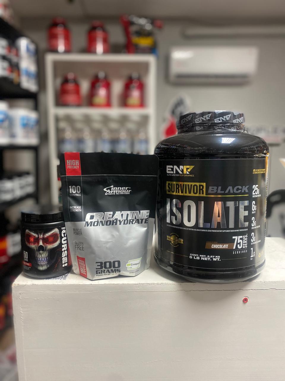 COMBO ( SURVIVOR BLACK ISOLATE 5 LBS, CREATINA INNER ARMOUR 100 SERV, THE CURSE 50 SERV )