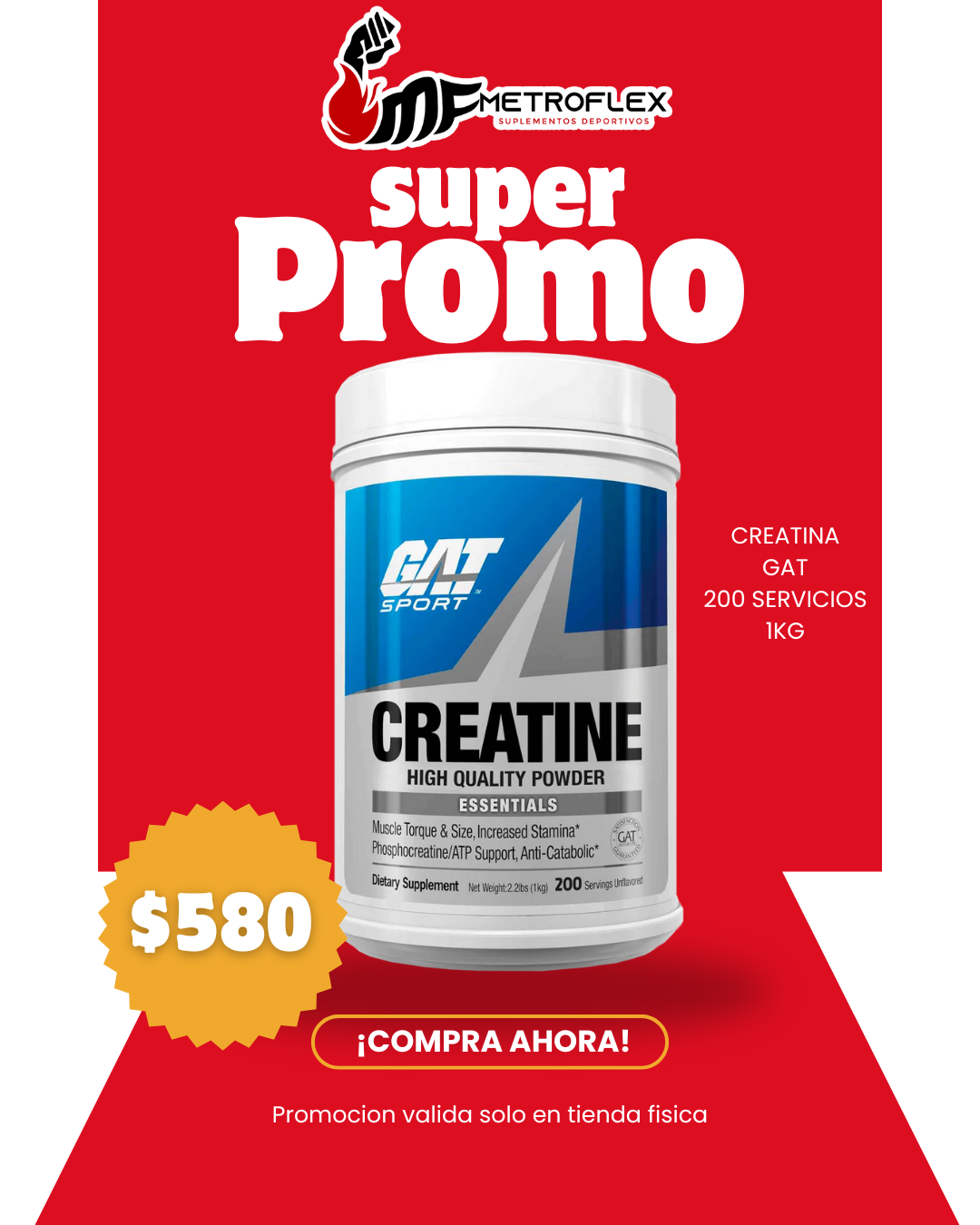 La CREATINA GAT 1 KG 200 SERVICIOS es un suplemento de alta calidad diseñado para aumentar la fuerza y la potencia muscular.