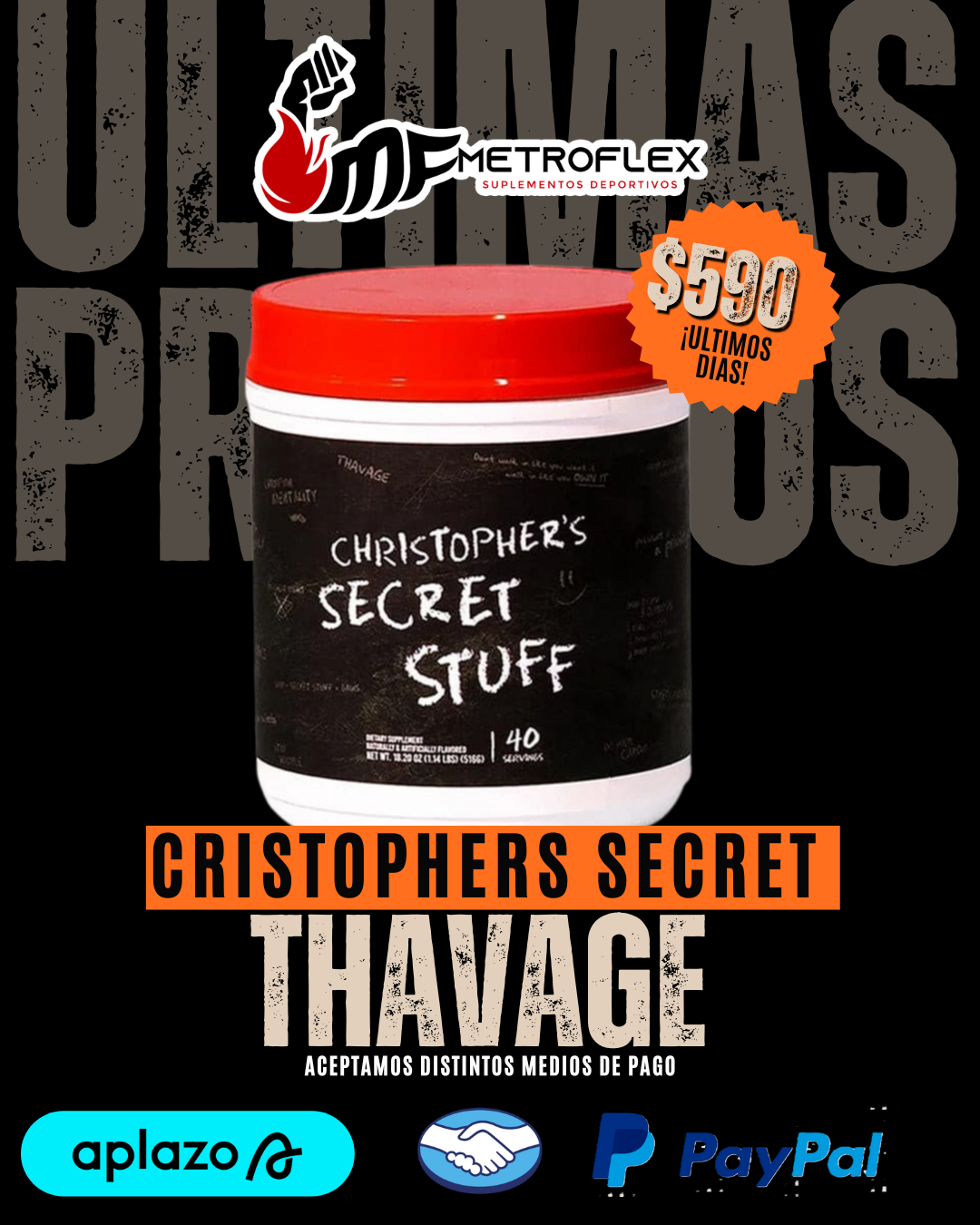 Thavage – Christopher’s Secret Stuff es un pre-workout premium creado para quienes buscan entrenar con intensidad, enfoque y consistencia. Su fórmula está pensada para apoyar tus niveles de energía, ayudarte a mantener la concentración durante tus rutinas y brindarte una sensación de “pump” que potencia cada repetición.